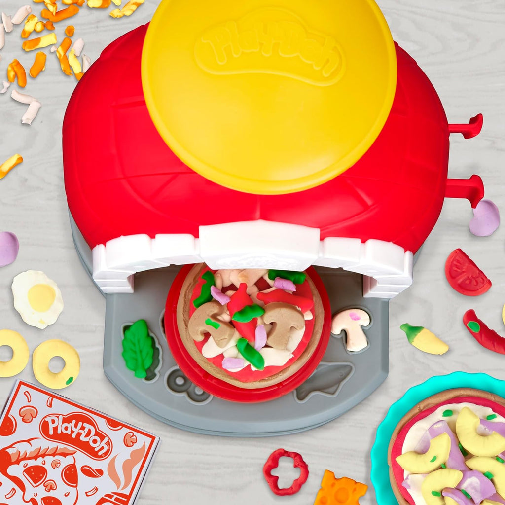 Imagination is on the menu with this toy pizza oven! Kids can play pretend chef as they stamp and spin out creative Play-Doh pizzas with over 25 possible pretend toppings. The play food set includes 8 tools to help inspire future cooks' creativity, and 6 modeling compound colors including a tricolor can with pizza-themed colors. Kids can also get their pretend pizzas ready for delivery in the pizza box. This Play-Doh set makes a great activity, gift, or arts and crafts toy for kids 3 years and up! Hasbro, Play-Doh, and all related properties are trademarks of Hasbro.